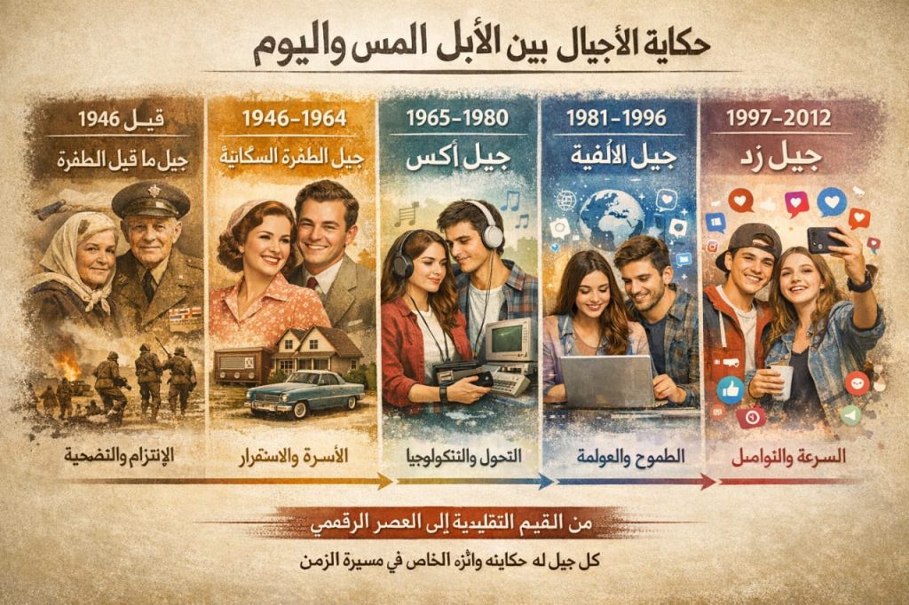 أما من ولدوا بين 1997 و2012 فقد نشأوا في قلب حقبة الثورة الرقمية الكاملة، حيث أصبح الإنترنت ووسائل التواصل جزءاً لا يتجزأ من الحياة اليومية. هذا الجيل، المعروف بجيل زد، يتميز بالسرعة، والتواصل المفتوح، والجرأة في التعبير عن الرأي، ويرى العالم كمساحة واحدة بلا حدود واضحة.
