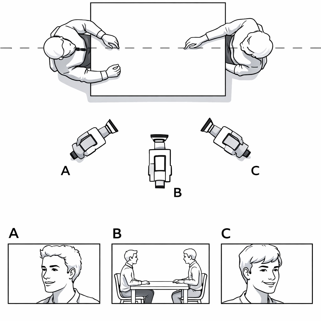 الصور أمامنا تستعرض مجموعة من أهم تقنيات التغطية السينمائية للحوار المستخدمة في السينما والتلفزيون، والمفهومة ضمنيًا عند المحترفين، لكن تنفيذها الدقيق هو ما يصنع الفارق.